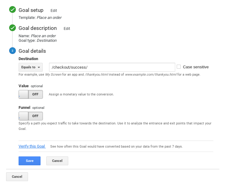 If you are looking to set up a Goal in GA using the "Place an order" template, you can use the Destination URL of "/checkout/success/".